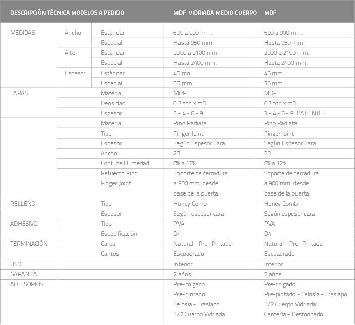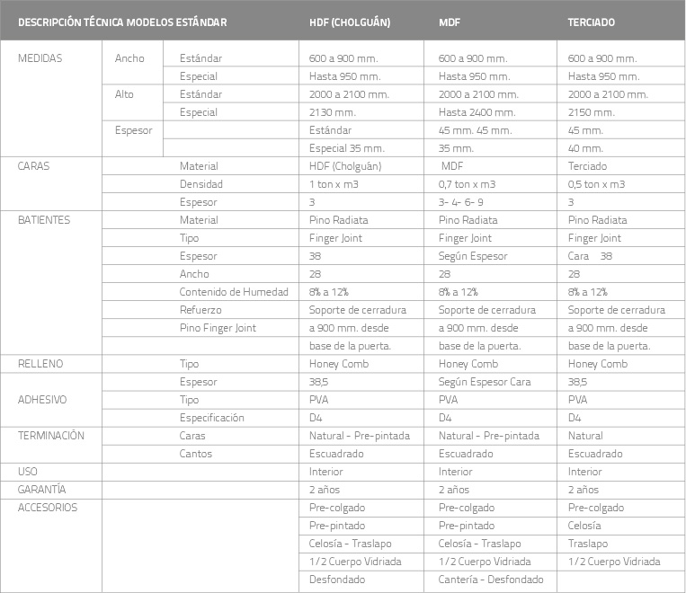 En su elaboración se utiliza el sistema de relleno Honey Comb (Panal de Abeja), que junto a sus batientes de madera sólida unida por Finger Joint, le dan una solidez estructural inigualable.