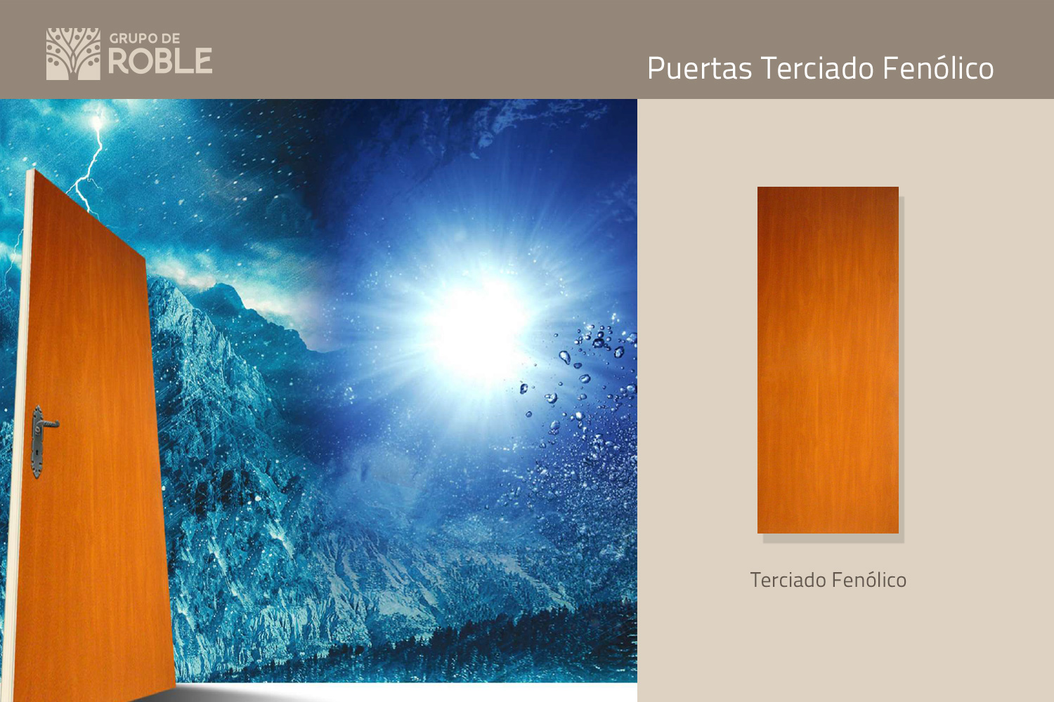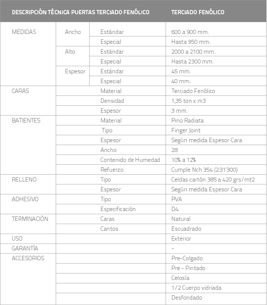 Puertas Terciado Fenólico: De 5.2 mm. fabricadas con resina formaldehido, tipo WBP, de bajo nivel de emisión (E1), que permite asegurar una alta durabilidad en ambientes húmedos y condiciones de intemperie. Gran estabilidad dimensional, alta resistencia mecánica a la flexión, mayor aislación acústica y térmica. Puerta para uso exterior protegido.